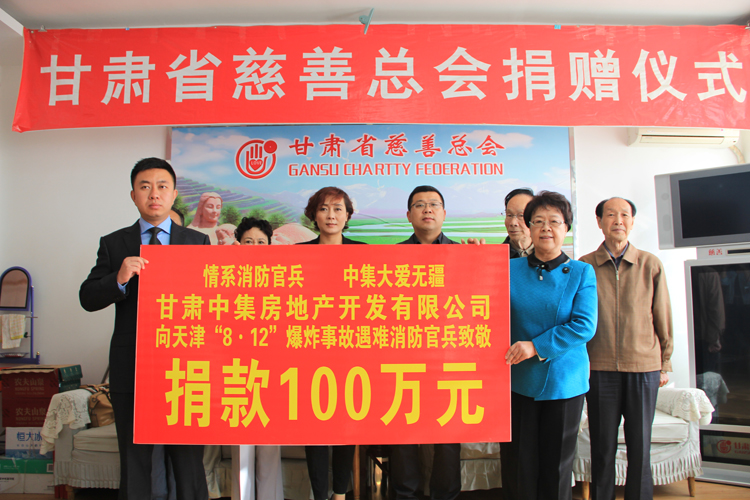 2015年8月12日23時(shí)30分,天津?yàn)I海新區(qū)國(guó)際物流中心發(fā)生重大爆炸火災(zāi)事故,造成重大人員傷亡。甘肅中集房地產(chǎn)開發(fā)有限公司總經(jīng)理周啟濤獲悉后,決定為在本次事故中犧牲的消防官兵及其家屬捐款100萬元,用于幫助犧牲消防官兵家屬善后事宜的處理,以盡一份甘肅企業(yè)的慈善愛心。