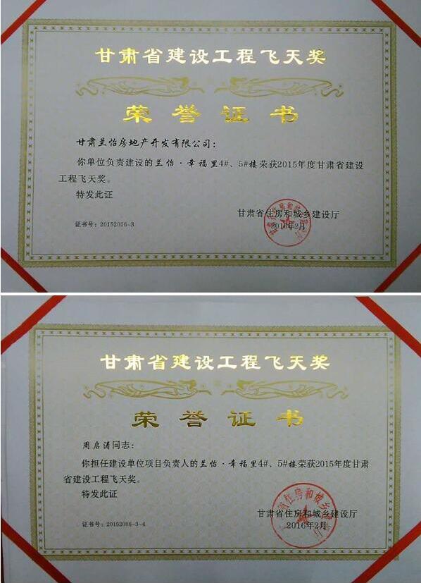 2016年2月5日,由甘肅省住房和城鄉(xiāng)建設(shè)廳評(píng)選的2015年度甘肅省建設(shè)工程“飛天獎(jiǎng)”對(duì)社會(huì)各界發(fā)布,本次共發(fā)布41個(gè)“飛天獎(jiǎng)”項(xiàng)目。其中,由甘肅中集實(shí)業(yè)集團(tuán)子公司甘肅蘭怡房地產(chǎn)開(kāi)發(fā)有限公司開(kāi)發(fā)建設(shè)的中集·幸福里憑借高品質(zhì)的開(kāi)發(fā)標(biāo)準(zhǔn),喜獲甘肅省2015年度建設(shè)工程“飛天獎(jiǎng)”榮譽(yù)稱號(hào),成為蘭州市安寧區(qū)唯一獲此殊榮的項(xiàng)目。