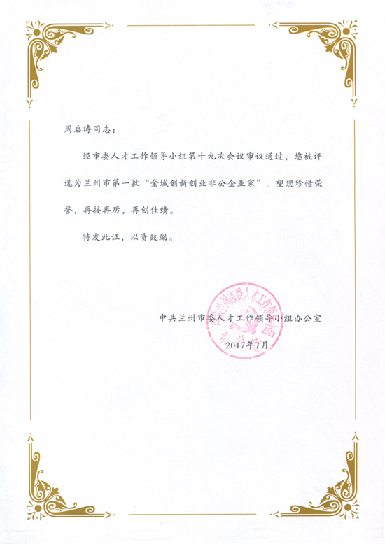 2017年11月22日,甘肅中集實(shí)業(yè)集團(tuán)有限公司董事長周啟濤榮膺蘭州市首屆“金城創(chuàng)新創(chuàng)業(yè)非公企業(yè)家”;