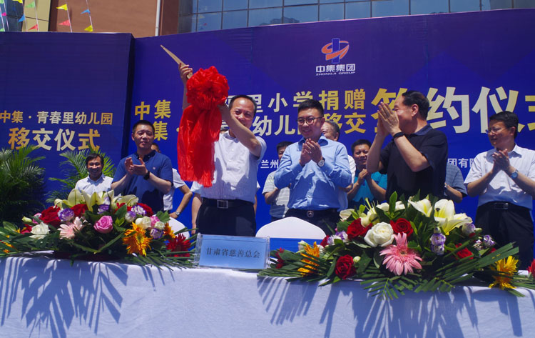 2017年6月22日下午14時,甘肅中集實業(yè)集團有限公司通過甘肅省慈善總會,向蘭州市安寧區(qū)人民政府捐贈價值1.02億元中集•幸福里小學(xué)暨中集•青春里配建幼兒園移交儀式在中集•幸福里小學(xué)操場隆重舉行。甘肅省原人大常委會副主任、甘肅省慈善總會會長朱志良,甘肅省原民政廳黨組書記、廳長、甘肅省慈善總會常務(wù)副會長梁國安,甘肅省教育廳副廳長趙 凱,蘭州市人大常委會副主任孫曉鋼,蘭州市人民政府副秘書長淡漢榮,安寧區(qū)區(qū)委書記王 方及安寧區(qū)區(qū)委副書記、區(qū)長雒澤民攜安寧區(qū)委、區(qū)人大、區(qū)政府、區(qū)政協(xié)四大班子領(lǐng)導(dǎo),蘭州市教育局、蘭州市國土局、蘭州市規(guī)劃局、蘭州市房產(chǎn)局相關(guān)領(lǐng)導(dǎo)出席捐贈儀式,甘肅中集實業(yè)集團有限公司黨委書記、董事長周啟濤代表公司完成與安寧區(qū)人民政府捐贈及移交簽約。