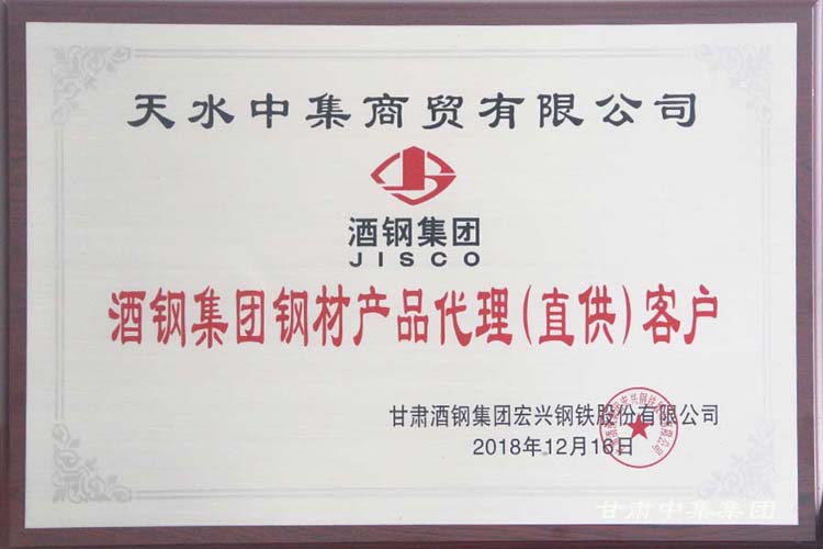 2018年12月12日,由酒鋼集團(tuán)宏興鋼鐵股份有限公司組織的“2019年酒鋼碳鋼產(chǎn)品推介暨客戶座談會(huì)”及“2018年度全國百家金牌供應(yīng)商頒獎(jiǎng)典禮”在蘭州皇冠假日酒店召開。甘肅中集實(shí)業(yè)集團(tuán)有限公司及下屬子公司蘭州中集商貿(mào)有限公司、天水中集商貿(mào)有限公司榮獲“酒鋼集團(tuán)鋼鐵產(chǎn)品代理(直供)客戶”及“2018年度金牌代理商”殊榮。