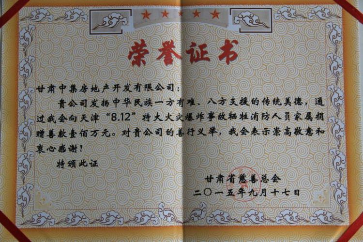 2015年8月12日23時(shí)30分,天津?yàn)I海新區(qū)國際物流中心發(fā)生重大爆炸火災(zāi)事故,造成重大人員傷亡。甘肅中集房地產(chǎn)開發(fā)有限公司總經(jīng)理周啟濤獲悉后,決定為在本次事故中犧牲的消防官兵及其家屬捐款100萬元,用于幫助犧牲消防官兵家屬善后事宜的處理,以盡一份甘肅企業(yè)的慈善愛心。